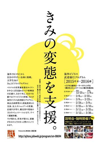 どうも、村上友哉です。 もうすぐ武者修行プログラムが始まります。 武者修行プログラムとは、現地のお店を貸し切り、そのお店の売り上げを上げるための様々な工夫をするという体験型海外インターンシップです。例えばアパレルのお店だと新製品の開発をした…